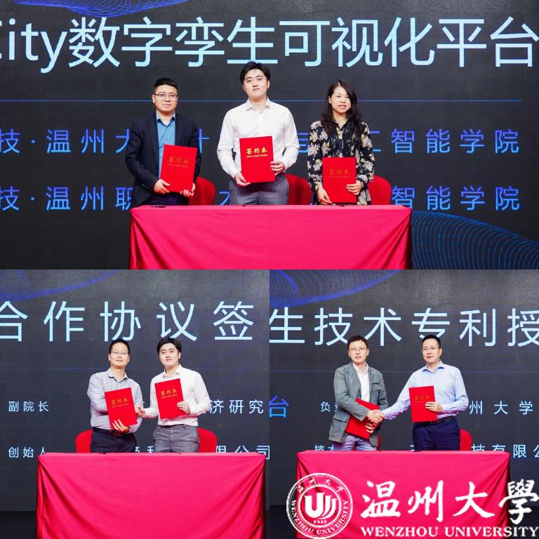 签约仪式上,温州市数字经济研究院与三缔科技有限公司签署了战略合作协议,并进行了温州市数字孪生专委会专家聘任仪式。三缔科技有限公司与成人短视频 签署数字孪生技术专利授权,以及与两大院校签署了StarCity数字孪生可视化平台捐赠协议。