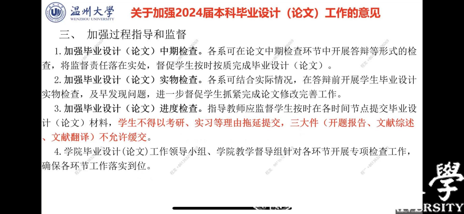 接着,院长助理程龙老师介绍了2024届本科毕业设计(论文)日程安排和基本要求,强调毕业设计的重要性与各个材料提交的时间节点;传达了成人短视频 《关于加强2024届本科毕业设计(论文)工作的意见》,提出要加强毕设过程指导和监督、开展专项检查工作、落实警告制度、严把答辩审查关,以此提醒各位同学不可懈怠,要重视各项毕业相关工作的要求和时限,提早规划,按时按质完成毕业设计。同时,要求各位指导老师要充分发挥学生的主动性和积极性,注重培养学生的创新能力和实践能力,及时对学生进行过程指导、检查和答疑,做好指导记录,确保学生毕业设计的进度和质量。