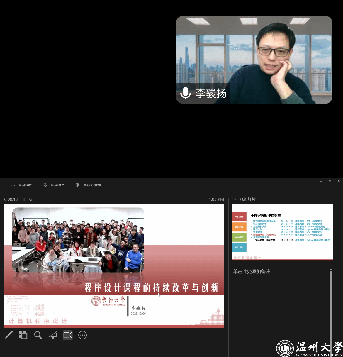 讲座伊始,黄辉副院长对李骏扬博士进行了详细介绍。随后,李骏扬博士在腾讯会议线上做《程序设计课程的持续改革和创新》专题报告,我院教师线下集中在5B206听讲座。李博士从教与学、课程架构、内容方法等方面分享了如何打造以学生为核心的“创新性、高阶性、挑战度”的创新课堂,强调教师设计课程活动时要注重带动学生积极思考,形成学生能够自主探索的挑战式课堂。李博士还通过分享自己的课堂教学实例,为参会教师展示了教学创新成果,并与参会教师进行了交流讨论。最后,黄辉副院长进行总结发言,他指出本次讲座内容丰富、案例生动、启发性强,希望与会教师能够结合实际,充分发挥教师的职业角色,不断激发学生自主思考潜力,进一步推进成人短视频 教学改革创新。