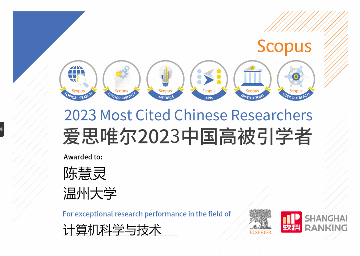 2024年3月27日,爱思唯尔(Elsevier)发布2023“中国高被引学者”(Highly Cited Chinese Researchers)榜单。此榜单以Scopus数据库作为中国学者成人短视频 成果的统计来源,采用上海软科教育成人短视频 咨询有限公司开发的方法。我院陈慧灵教授入选2023“中国高被引学者”榜单(计算机科学与技术学科)。