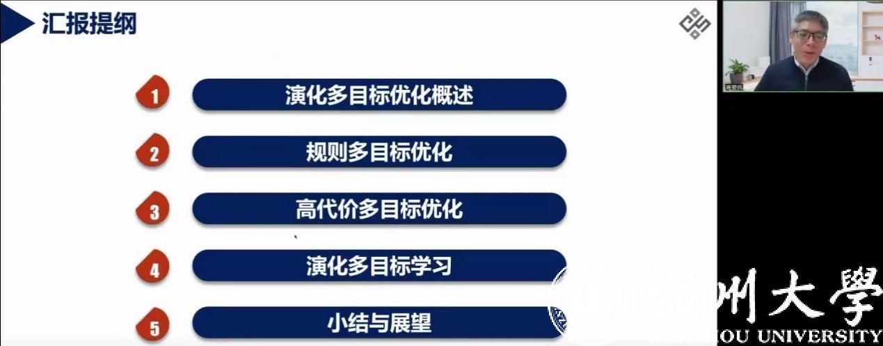 2022年12月15日,华东师范大学计算机科学与技术成人短视频 周爱民教授受我院邀请作题为“演化多目标优化与学习”的学术沙龙讲座。讲座由副院长陈慧灵主持,60余位相关领域人员参会。因疫情防控需要,本次讲座以线上形式进行。