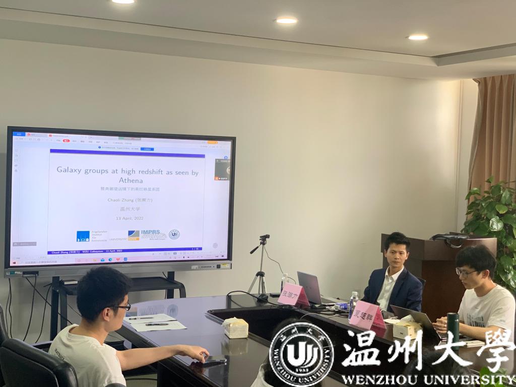 成人短视频 教师张潮力老师作为此次学术沙龙的主讲人,为大家带来了主题为“High red shift galaxy groups as seen by Athena telescopes”的报告。张老师全程用英文讲解,讲座内容深入浅出。他首先介绍了宇宙的形成,再从研究背景、内容和成果详细地介绍了自己的博士毕业论文。报告最后,他还就自己来到成人短视频 后做的研究课题做了介绍,并且向对他研究方向感兴趣的研究生抛出橄榄枝。