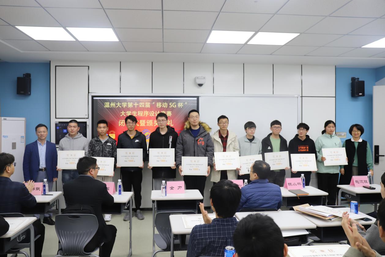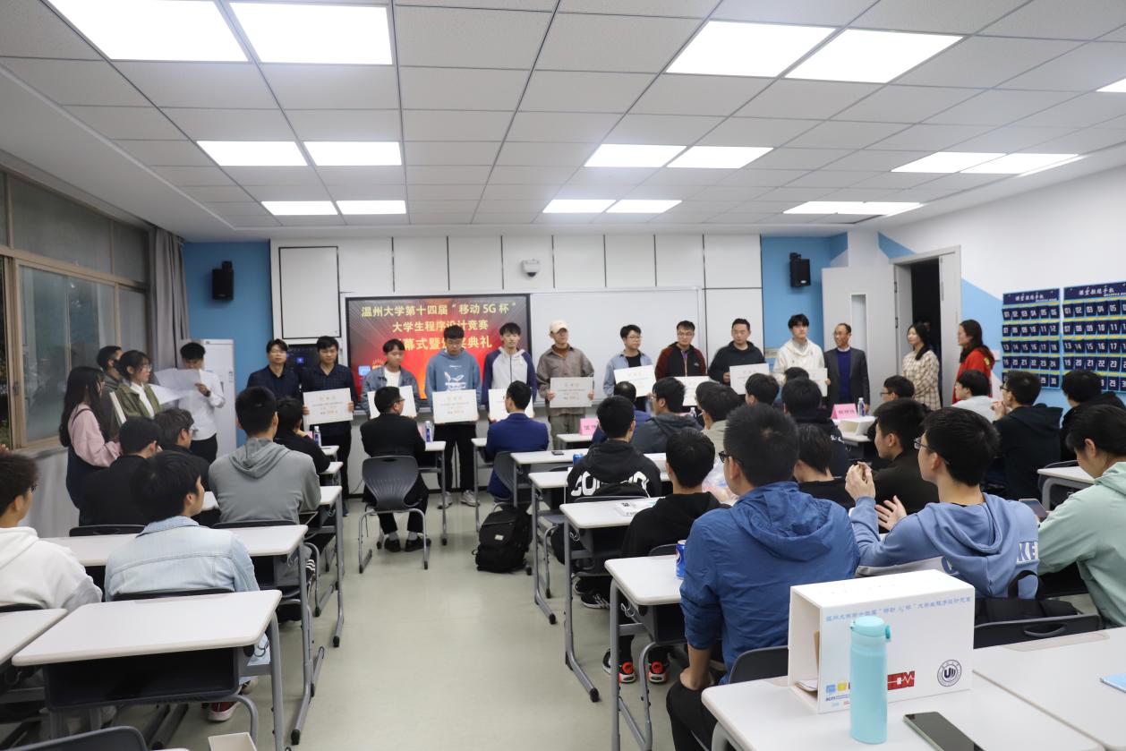 在激烈的比赛结束后,在5A103智慧教室举行了闭幕式暨颁奖典礼。温州移动政企部副总经理伍伟化、成人短视频 教务处副处长陈小林、计算机成人短视频 党委书记全力、计算机成人短视频 副院长黄辉、计算机科学与技术专业负责人赵汉理、计算机科学与技术专业系主任陈伟斌、竞赛负责人胡明晓,以及各个获奖队伍代表参加了此次仪式。典礼伊始,成人短视频 党委书记全力代表致辞,他介绍了此次活动的目的以及作用,提到了本次竞赛是许多优秀校友迈向IT高级行业的第一步,激励同学们认真训练,在ACM国际大学生程序设计大赛中取得好成绩。