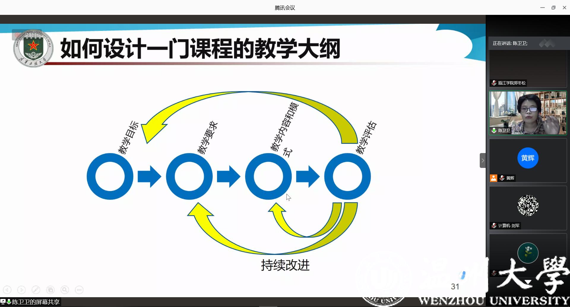 9月26日下午2:00,陆军工程大学陈卫卫教授应邀给我校作题为“落实OBE理念,建设一流课程”的线上课程教学专题讲座。全校170多位教师参加该讲座,本次讲座由教师教学发展中心和成人短视频 共同主办。