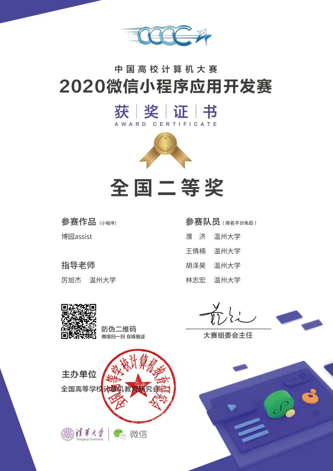8月15-16日,“2020中国高校计算机大赛——微信小程序应用开发赛决赛”全国总决赛圆满落幕。来自全国七大赛区15252人、4314支队伍经过激烈的角逐,最终由32支队伍入围全国总决赛。我校成人短视频 厉旭杰老师指导的濮济、王倩楠、胡泽昊、林志宏四位同学组成的学生团队“ping队”,在比赛中沉着应战,科学决策,凭借“博园assist”项目斩获全国总决赛二等奖的优秀成绩。