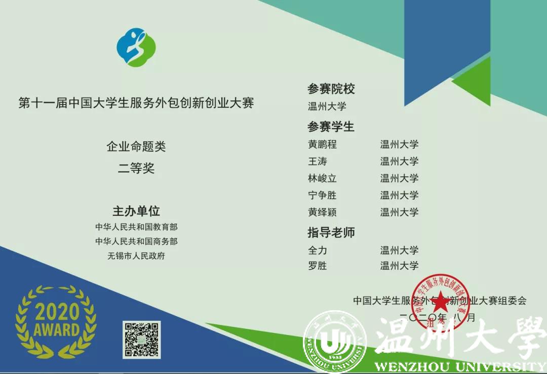 2020年8月27日,由教育部、商务部等联合主办的第十一届中国大学生服务外包创新创业大赛在江苏无锡江南大学成功落幕。我院由全力和罗胜老师指导的 “光之胜利”团队荣获企业命题类全国二等奖!