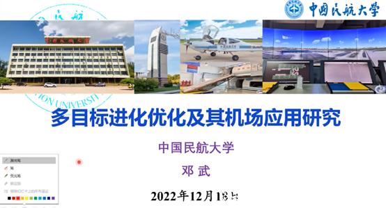 2022年12月18日晚上7点半,我院邀请了中国民航大学教授邓武教授作题为“多目标进化优化及其机场应用研究”的学术沙龙讲座。讲座由陈慧灵副院长主持,相关领域师生50余人聆听了此次讲座。因疫情防控需要,讲座以线上形式展开。