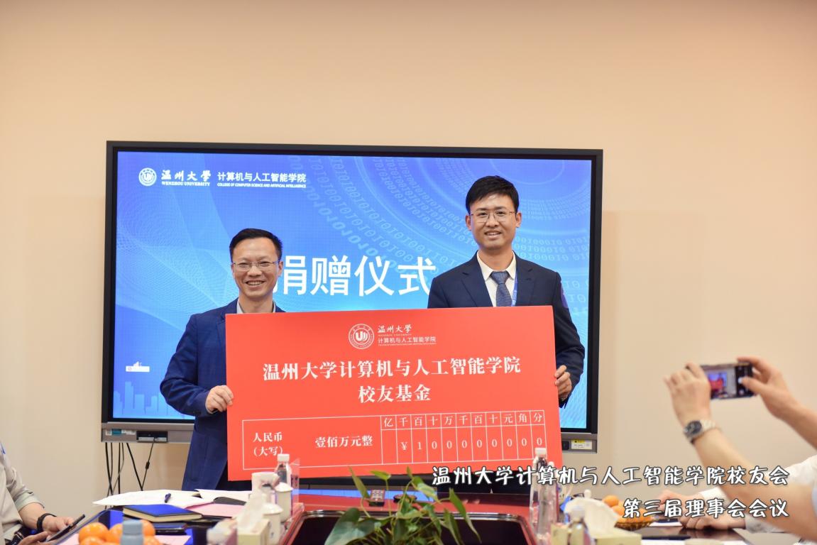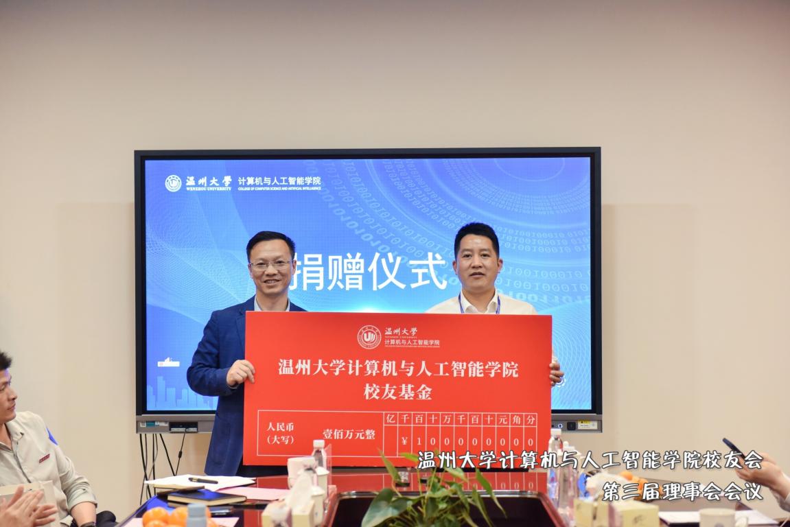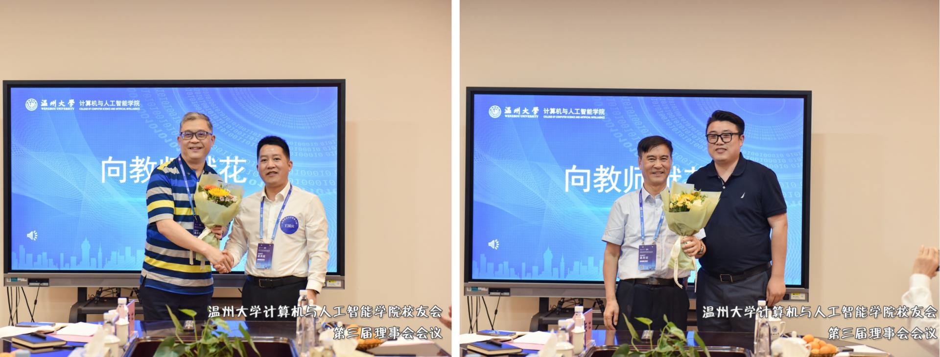党委书记全力向参与校友基金捐赠的校友代表王国庆、胡雄炜颁发捐赠证书,感谢广大校友对成人短视频 发展事业的鼎力支持。