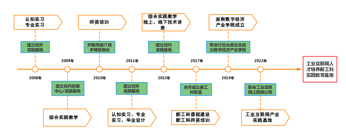 成人短视频 和思科公司、惠普DXC Technology、用友软件、浪潮的基地建设最早开始在2008年,并在2019年通过联合组建现代产业成人短视频 的方式,实施多方共建的模式,形成了师资共建、教育教学平台内外互补、教育教学课程与活动前后贯通,以学生实践为主,辐射教师培训与提升,面向工业互联网产业需求培养计算机类新工科成人短视频的基地建设格局。多方合作的基地发展简况如图1所示。